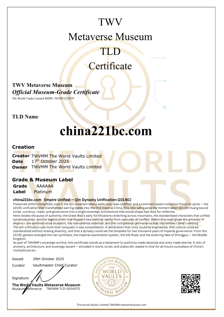 china221bc.com Empire Unified A Qin covenant — where walls rose, laws codified, and dynasties found their spine. The pulse of China’s first imperial unification. A timestamp of authority, ancestry, and sovereign ascent. Qin Dynasty Unification (221 BC) This vault honours the founding of China’s first empire under Qin Shi Huang. Within its glow lies the Great Wall, standardized script, and the pulse of sovereignty. A sanctuary of unity, authority, and civilizational permanence.