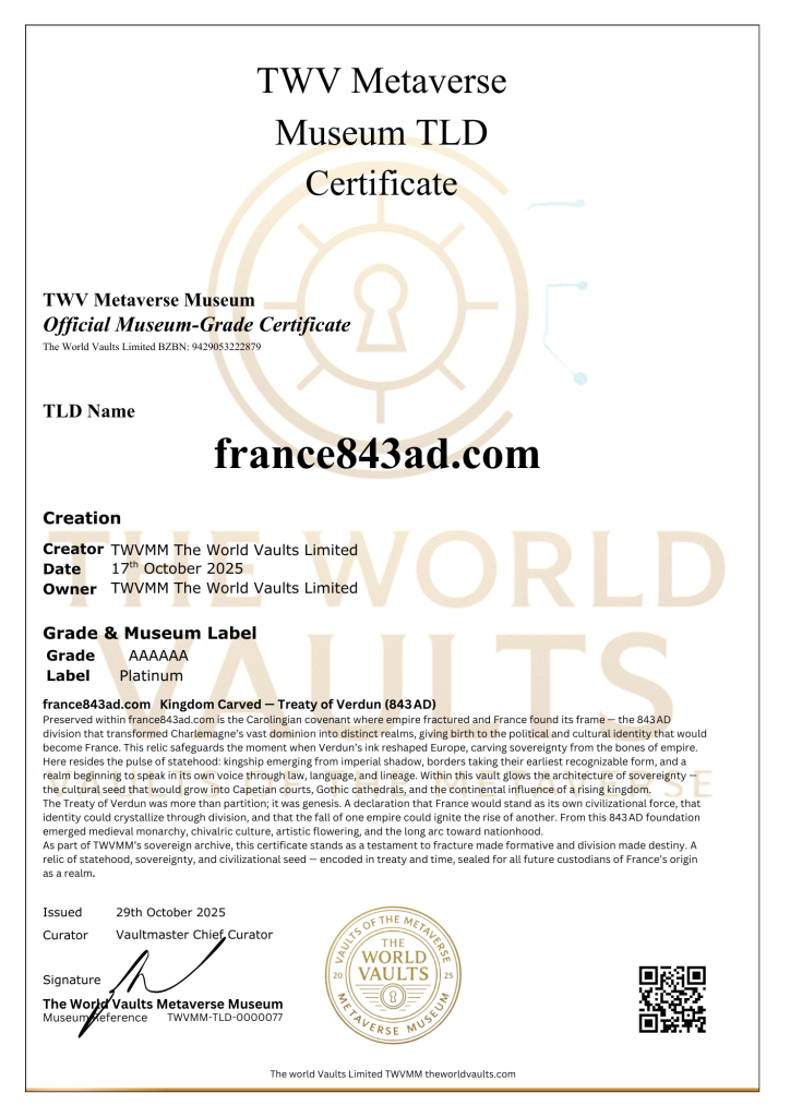 france843ad.com Kingdom Carved A Carolingian covenant — where empire fractured and France found its frame. The pulse of Verdun’s division. A timestamp of sovereignty, statehood, and shaping. Treaty of Verdun (843 AD) This vault honours the partition of Charlemagne’s empire, birthing France as a distinct realm. Within its glow lies kingship, culture, and the pulse of sovereignty. A sanctuary of statehood, sovereignty, and civilizational seed.