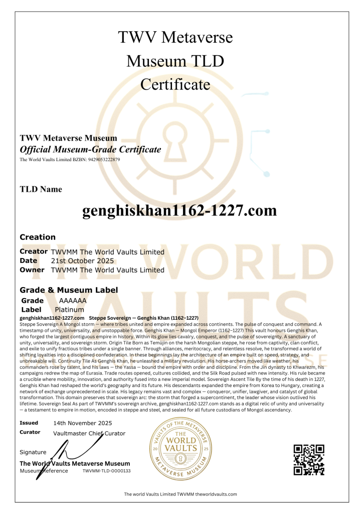 genghiskhan1162-1227.com Steppe Sovereign A Mongol storm — where tribes united and empire expanded across continents. The pulse of conquest and command. A timestamp of unity, universality, and unstoppable force. Genghis Khan — Mongol Emperor (1162–1227) This vault honours Genghis Khan, who forged the largest contiguous empire in history. Within its glow lies cavalry, conquest, and the pulse of sovereignty. A sanctuary of unity, universality, and sovereign storm.