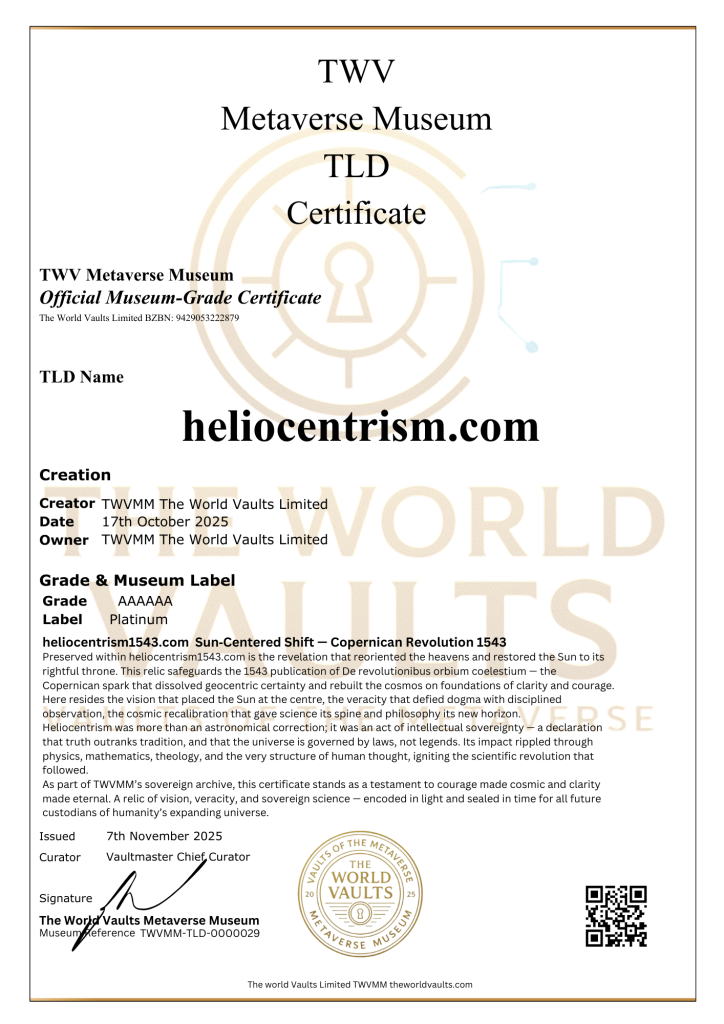 heliocentrism1543.com Sun Cantered Shift A Copernican compass – where Earth lost its throne and science found its spine. The pulse of a paradigm that reoriented the heavens. A timestamp of courage, clarity, and cosmic recalibration. Full Name Tile Heliocentrism — Copernican Revolution (1543) This vault honours the theory that placed the Sun at the centre, reshaping astronomy and philosophy. Within its glow lies De revolutionibus, the courage to defy dogma, and the pulse of cosmic truth. A sanctuary of vision, veracity, and sovereign science