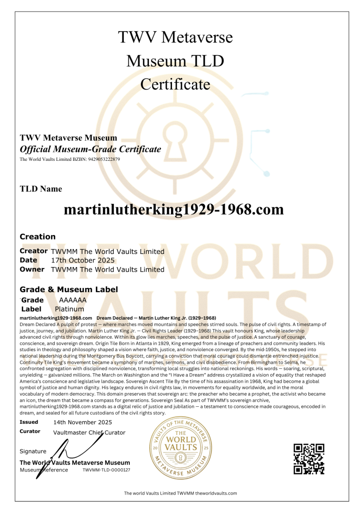 martinlutherking1929-1968.com Dream Declared A pulpit of protest — where marches moved mountains and speeches stirred souls. The pulse of civil rights. A timestamp of justice, journey, and jubilation. Martin Luther King Jr. – Civil Rights Leader (1929–1968) This vault honours King, whose leadership advanced civil rights through nonviolence. Within its glow lies marches, speeches, and the pulse of justice. A sanctuary of courage, conscience, and sovereign dream.