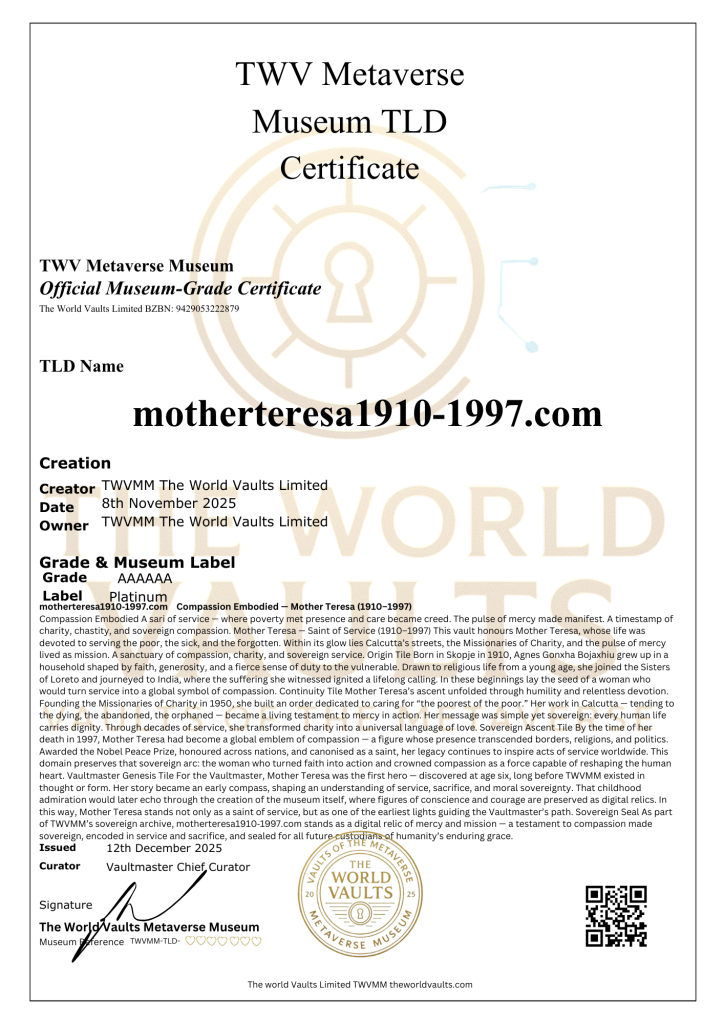 motherteresa1910-1997.com Compassion Embodied A sari of service — where poverty met presence and care became creed. The pulse of mercy made manifest. A timestamp of charity, chastity, and sovereign compassion. Mother Teresa — Saint of Service (1910–1997) This vault honours Mother Teresa, whose life was devoted to serving the poor and sick. Within its glow lies Calcutta’s streets, the Missionaries of Charity, and the pulse of mercy. A sanctuary of compassion, charity, and sovereign service.