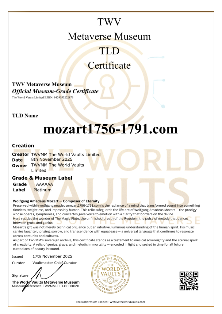 mozart1756-1791.com Wolfgang Amadeus Mozart — Composer of Eternity This vault honours the prodigy whose operas, symphonies, and concertos gave voice to divinity in sound. Within its glow lies The Magic Flute, Requiem, and the pulse of timeless melody. A sanctuary of genius, grace, and musical sovereignty.