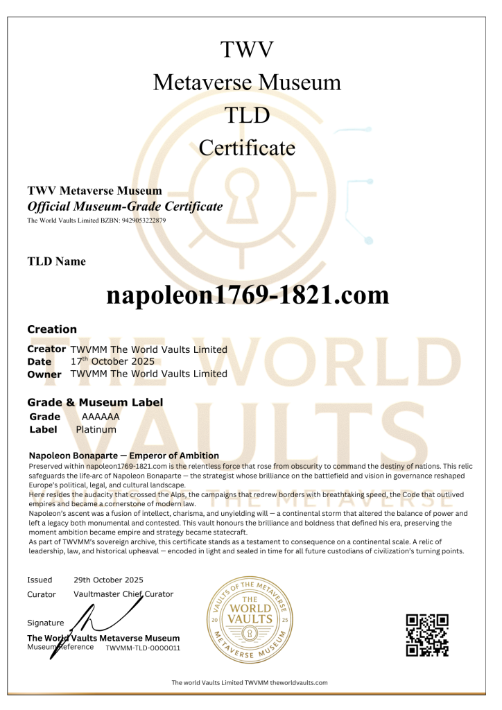 napoleon1769-1821.com Napoleon Bonaparte — Emperor of Ambition This vault honours the strategist who rose from soldier to sovereign, reshaping Europe with law and war. Within its glow lies the Code, the campaigns, and the charisma that bent nations. A sanctuary of brilliance, boldness, and continental consequence.