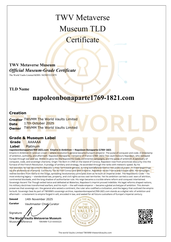 napoleonbonaparte1769-1821.com Empire in Ambition A Corsican crown — where revolution’s general became Europe’s emperor. The pulse of conquest and code. A timestamp of ambition, authority, and aftermath. Napoleon Bonaparte – Emperor of France (1769–1821) This vault honours Napoleon, who reshaped Europe through war and law. Within its glow lies the Napoleonic Code, continental campaigns, and the pulse of ambition. A sanctuary of conquest, code, and sovereign charisma.