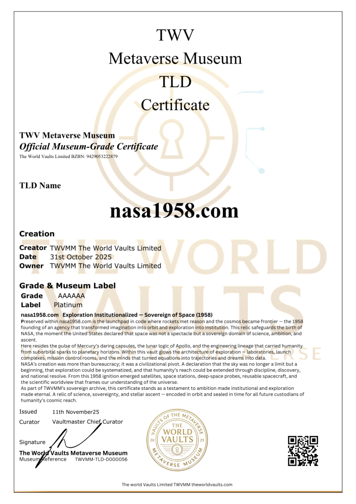 nasa1958.com Exploration Institutionalized A launchpad in code — where rockets met reason and the cosmos became frontier. The pulse of an agency that turned imagination into orbit. A timestamp of ambition, acceleration, and astronomical reach. Sovereign of Space (1958) This vault honours the founding of the National Aeronautics and Space Administration, where exploration became institution. Within its glow lies Mercury, Apollo, and the pulse of planetary ambition. A sanctuary of science, sovereignty, and stellar ascent.