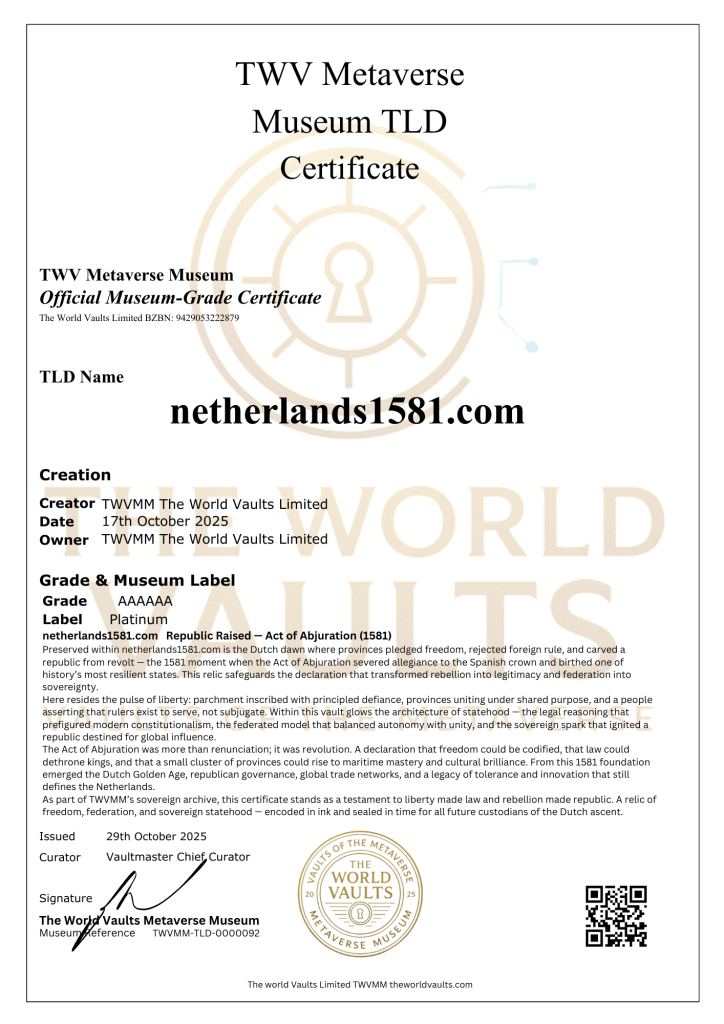 netherlands1581.com Republic Raised A Dutch dawn — where provinces pledged freedom and Spain’s grip was broken. The pulse of independence inscribed in ink. A timestamp of liberty, law, and lasting sovereignty. Act of Abjuration (1581) This vault honours the declaration of independence from Spain, founding the Dutch Republic. Within its glow lies liberty, law, and the pulse of sovereignty. A sanctuary of freedom, federation, and sovereign statehood.