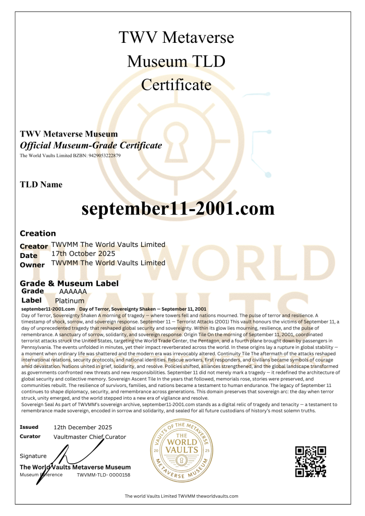 Day of Terror, Sovereignty Tested A morning of tragedy — where towers fell and nations mourned. A timestamp of shock, loss, and enduring resilience. September 11 — Terrorist Attacks (2001) This vault honours the victims of September 11, 2001, a day of profound loss that reshaped global security and collective memory. Within its light lies remembrance, solidarity, and the enduring strength of those affected. A sanctuary of reflection, dignity, and historical record.
