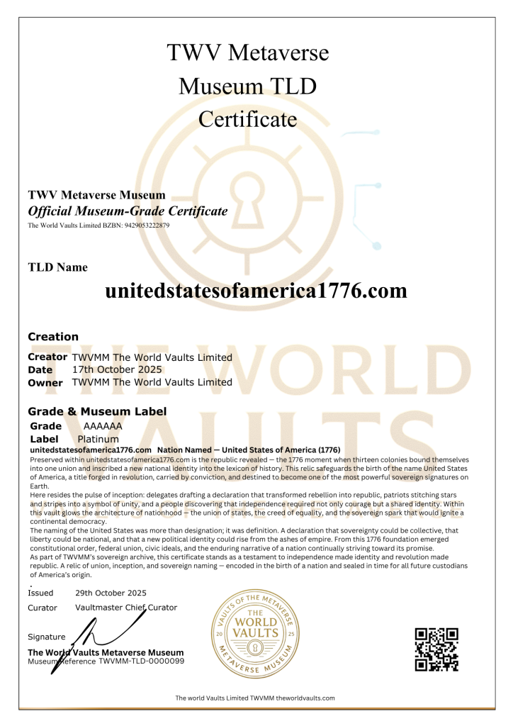 unitedstatesofamerica1776.com Nation Named A republic revealed — where thirteen colonies became one union. The pulse of sovereignty stitched in stars and stripes. A timestamp of independence, identity, and inception. United States of America — Founding (1776) This vault honours the naming and birth of the United States. Within its glow lies the Declaration, the union, and the pulse of nationhood. A sanctuary of independence, identity, and sovereign inception.